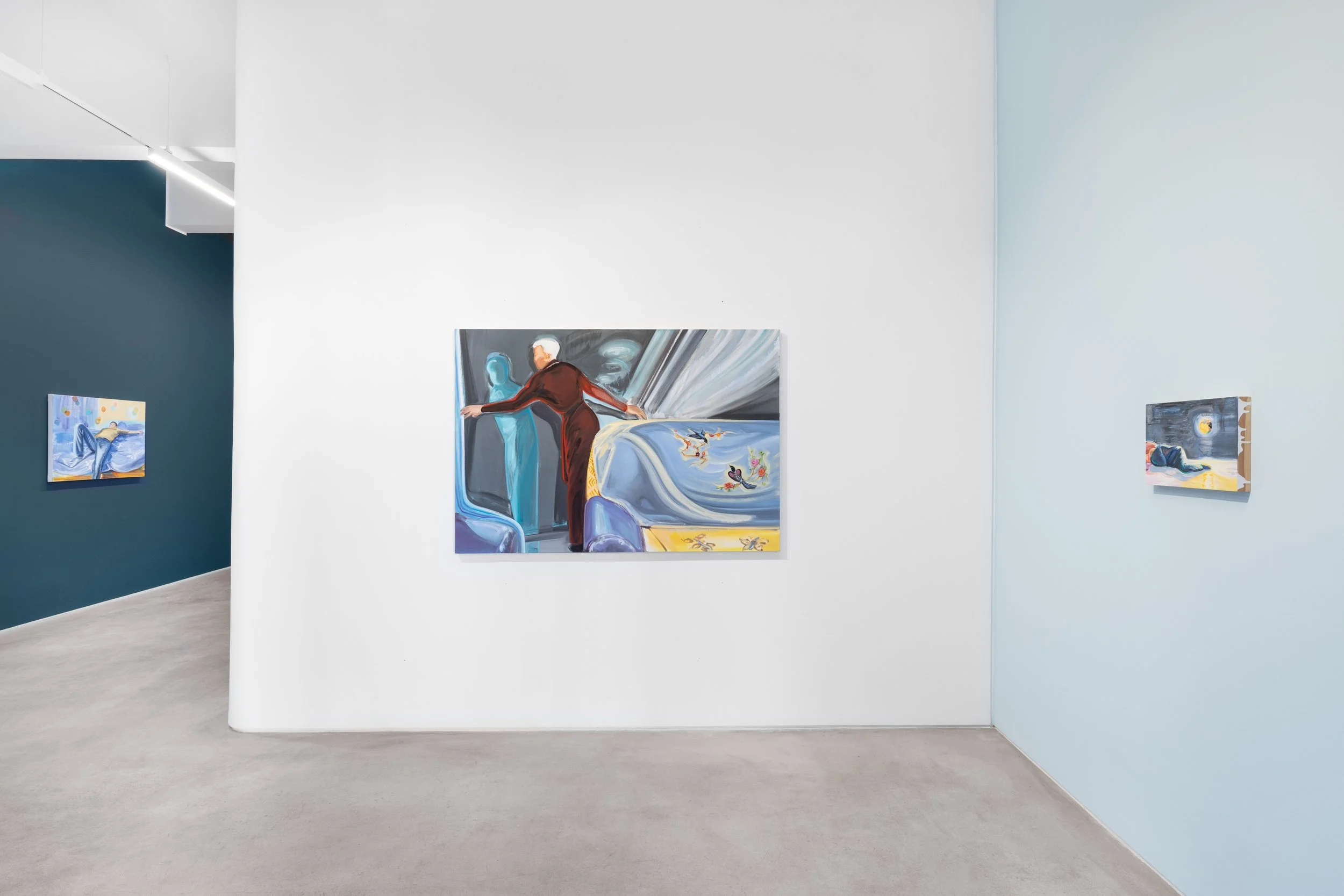 In this new body of work by Qianyu Li, the domestic settings in which the scenes depicted unfold seem to open up onto other dimensions. Windows—long a metaphor in painting—open onto the outside world, but that's not all: here, the exterior and interior interpenetrate and merge. Sometimes it seems as if the back wall itself is disappearing, with curtains like real stage wings opening onto a night sky, a mysterious backdrop onto which shadows with the sharp outlines of statues are projected, or a crescent moon appears in the darkest corner of the room.